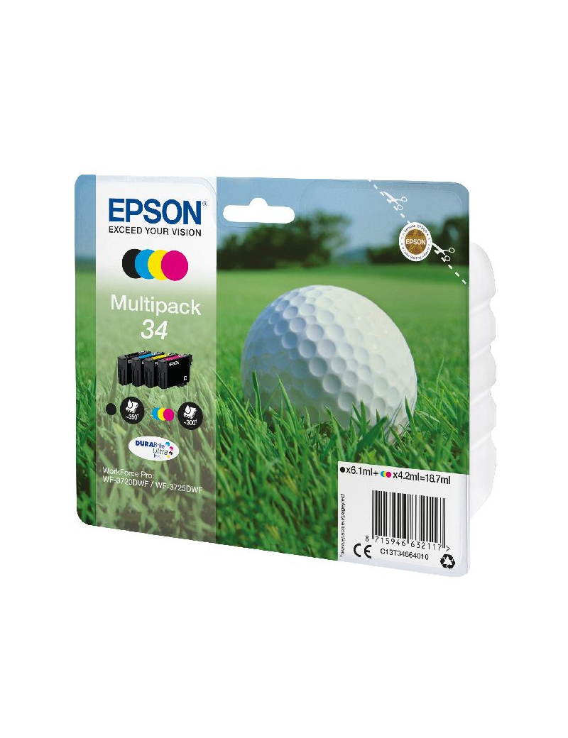 Consumibles: Cartuchos de tinta, Epson DURABrite? Ultra, 34, Bola de golf, Multipack, 1 x 6,1 ml Negro, 1 x 4,2 ml Amarillo, 1 x 4,2 ml Cian, 1 x 4,2 ml Magenta, RF+AM EPSON Multipack 4-colours 34 DURABrite Ultra Ink